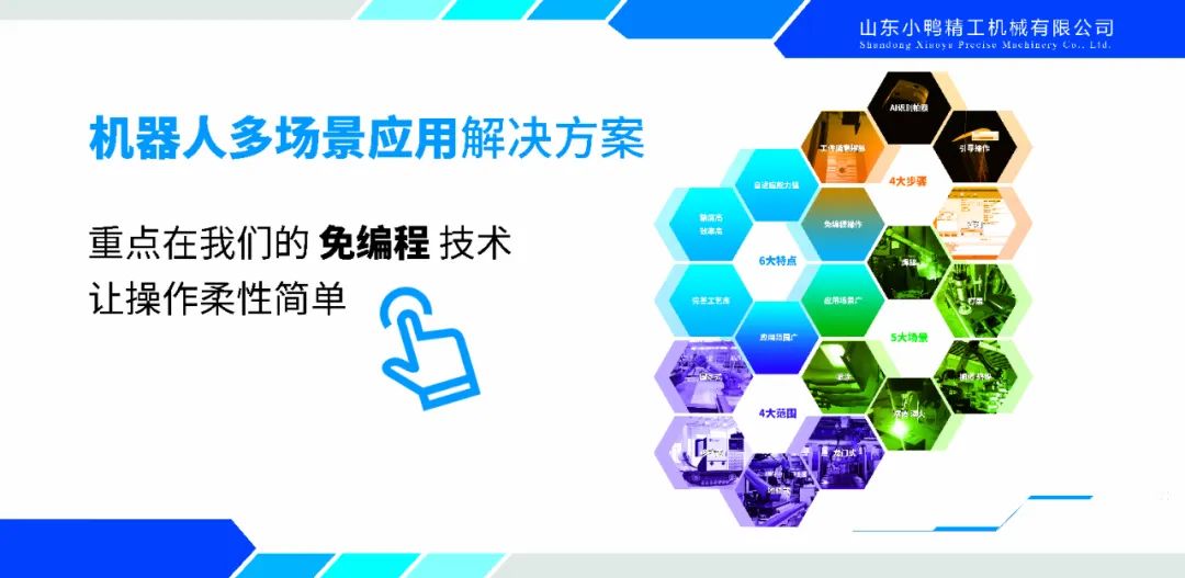 小鴨精工公司不僅可以一站式提供機器人多場景應用解決方案,實現交鑰匙工程,而且提供免編程技術支持,無需專業技術,讓操作更加柔性簡單,可以應用于移動式機器人工作站、機器人打磨、機器人搬運、機器人焊接、機器人點焊等應用場景,歡迎各界朋友來電咨詢!